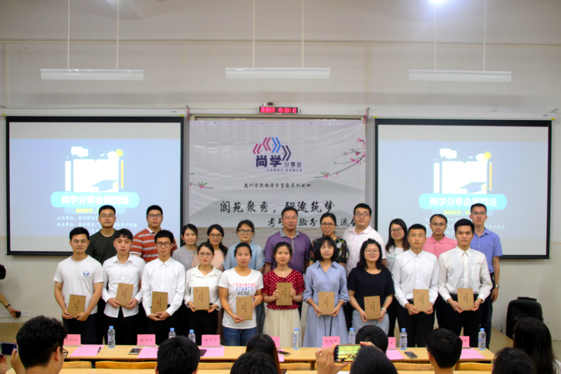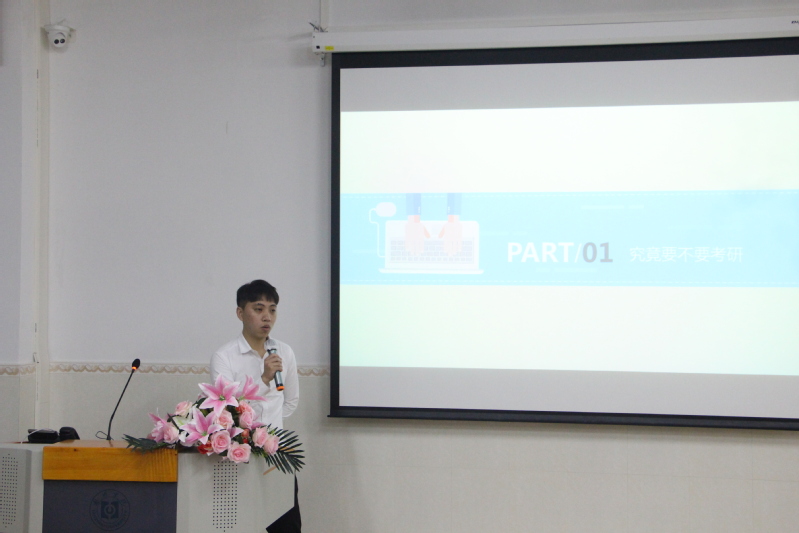 在考研分享环节,考研先进代表依次上台亮相,分别围绕考研时间规划、考研学校选择、复习时间安排和心理调适、考研复试、调剂等方面为大家介绍了考研的经验。其中来自电子学院考取广东工业大学的钟浩宇介绍了英语学习的有效途径,重在平日地积累;来自文传学院考取广州大学的曾思露同学和来自电子学院考取华中科技大学的张金泽分别分享了自己在面对实习、考研和学科竞赛时间冲突的心态调节历程。他们坦言尽管也曾焦虑过,但十足的努力换来的成长和收获;来自地理学院的钟仕萍和生科学院的陈向金同为考入华南师范大学学科教育专业,重点分享了教育综合类考试资源和心得,建议有针对性复习,考研重在坚持;来自数学与大数据学院考取暨南大学的陈龙洲讲述六人考研五人成功的学霸宿舍和来自计算机学院考取北京工业大学的陈文心诉说地域差异的传奇经历,故事娓娓道来,吸引掌声阵阵;来自电子学院考取深圳大学的张婵婷、来自政法学院考取华南理工的尤银燕和来自体育学院考取广西师范大学的曾秀苑,讲述了自己的复试逆袭经历,分享幽默风趣。