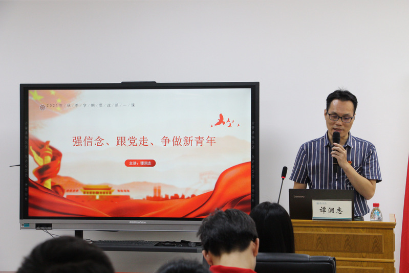 9月27日下午,我院党总支书记谭润志在电子楼205会议室作了题为“强信念、跟党走、争做新青年”的“思政第一课”。教务处督导组叶凡副教授、全体辅导员、学生党员、新生代表90余人参加了本次课程学习。