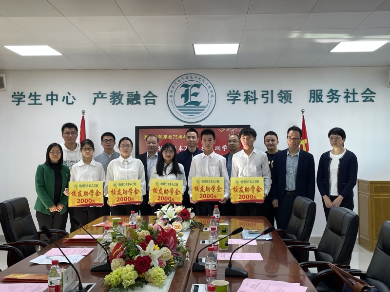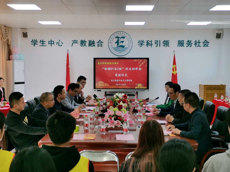 2021年11月27日上午,电子信息与电气工程学院2021年“01物理本2班校友助学金”颁发仪式在电子楼205会议室举行。出席本次颁发仪式的有班级校友代表黄艺先生、李想先生、伍勇先生、刘飞先生、叶裕斌先生、张永强先生,学院领导班子成员,辅导员代表,教师代表和受助学生。颁发仪式由党总支书记谭润志主持。