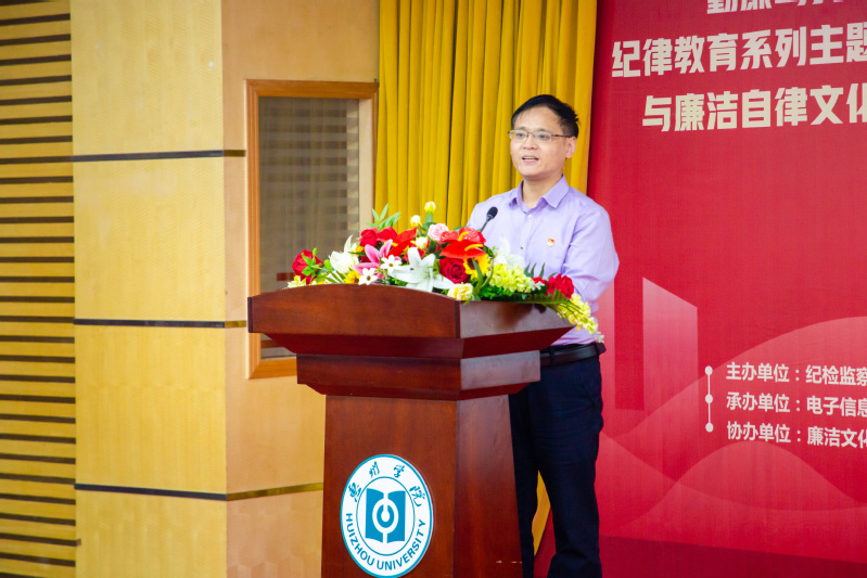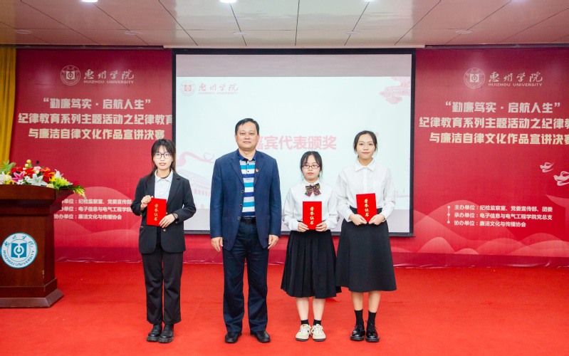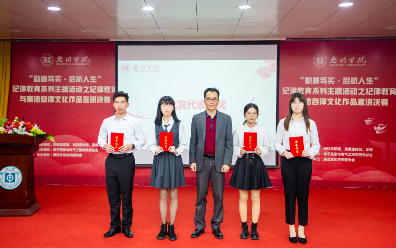 12月15日晚,根据学校2021年纪律教育学习月活动相关安排,由纪检监察室、党委宣传部、团委联合主办,电子信息与电气工程学院承办的“勤廉笃实,启航人生”纪律教育系列主题活动之纪律教育与廉洁自律文化作品宣讲决赛在图书馆报告厅举办。学校党委副书记、纪委书记、省监委驻惠州学院监察专员罗川山,纪检监察室、党委宣传部、团委、电子信息与电气工程学院有关负责人以及各二级学院师生代表到场观赛。