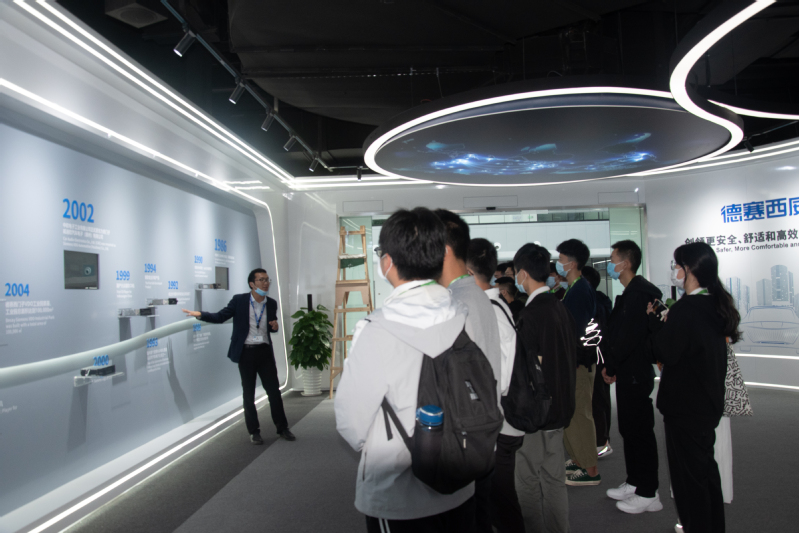 本次活动共分四个阶段。第一阶段,人力资源管理部的招商经理齐鹏军带领学员参观了德赛西威的科技展厅,讲解企业成长发展史及未来的布局;第二阶段,制造中心的冉浩先生带领学员参观了企业一体化无菌生产车间和企业住宿、生活区以及,让学员充分感受企业现代化、智能化的生产过程和温馨舒适的生活环境。第三阶段,智能驾驶事业部赵振峰经理介绍了本部门基本概况、成果以及发展规划。第四阶段,现场的赵振峰经理和人力资源部的蔡敏萍、巫伟东两位招商经理与带队老师在产学研合作方面交换了相关意见,并现场解答学生所提的问题,现场气氛十分活跃。