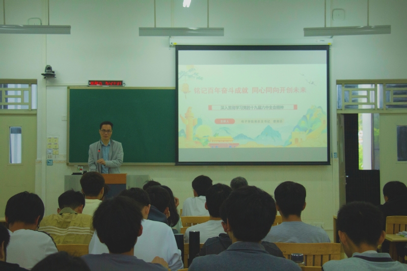 3月25日,我院党总支书记谭润志以“铭记百年奋斗成就 同心同向开创未来——深入贯彻学习党的十九届六中全会精神”为主题,在旭日科技大楼11-305为21级电信工程3、4班同学开讲新学期思政第一课。学校督导组许金泉教授参与听课。