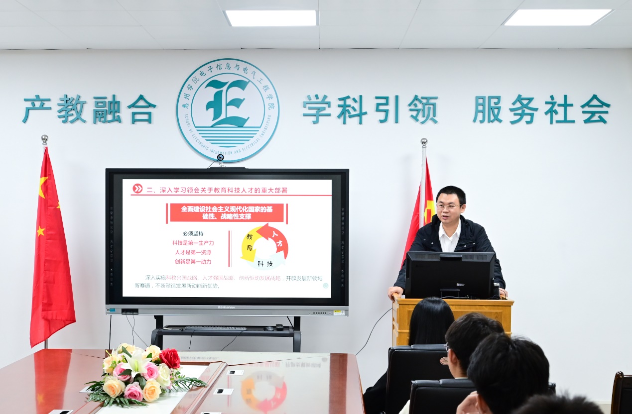 会上,余锋副书记以“踔厉奋发 勇往直前 做德智体美劳全面发展的社会主义建设者和接班人”为主题宣讲党的二十大精神。余锋从党的二十大召开背景讲起,分享了党的二十大精神的核心要义和丰富内涵,带领党员们深入学习了报告关于教育、科技、人才的重大部署,指出教育、科技、人才是全面建设社会主义现代化国家的基础性、战略性支撑,强调要立足“破题”,找准发力点,科技是第一生产力,创新是第一动力;要着力“答题”,赢得战略主动,深入实施人才强国战略;要全力“解题”,加快建设教育强国,办好人民满意的教育。他激励党员学生们要担当时代责任,坚定不移听党话、跟党走,怀抱梦想又脚踏实地,敢想敢为又善作善成,立志做有理想、敢担当、能吃苦、肯奋斗的新时代好青年。