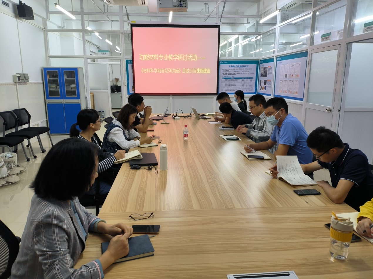 本次研讨会中专业教师都积极参与讨论并发言,大家为如何提高课程思政课程的教学效果集思广益。本次会议重点讨论了关于功能材料专业课程思政示范课程的事宜,计划将重点把《材料科学前沿系列讲座》课程打造为本专业的课程思政示范课程。本学期将录制8次课堂教学,教学内容中融入、贯穿思政内容,相关教师在本学期内对教学内容、教案、思政范例等资料进行归纳总结,为将来申报省级思政示范课程做准备。通过本次研讨会的召开,老师们对本专业课程思政教学统一了思想,打开了思路,也增强了信心。