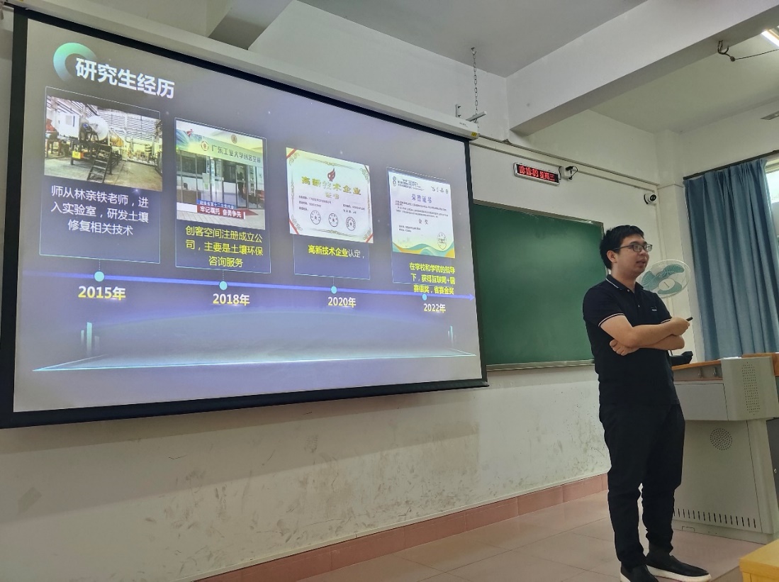 在课堂中,曾令泽总经理向同学们介绍了环境检测行业的前沿技术,与同学们分享了自己在学习和创业过程中遇到的问题以及心得体会。他以自己的亲身经历,向同学们讲述了如何更好地度过剩下的大学生活,如何规划好自己的职业生涯,以及如何才能从众多应届毕业生中脱颖而出。曾经理还介绍了他们公司在疫情期间如何利用公司最新土壤传感检测技术以及场地修复技术从企业项目向地方政府项目转型。课堂引起了同学们的极大兴趣,互动、讨论热烈。
