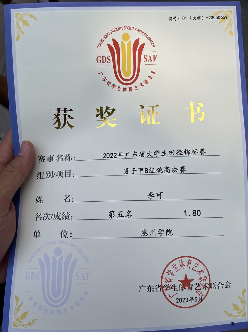 由广东省教育厅主办的2022年广东省大学生田径锦标赛于2023年5月18日至5月21日在华南理工大学(五山校区)举行,我院3名运动员代表学校参赛。经过激烈角逐,许焕林同学在男子甲B组5000米决赛获第三名、李可同学在男子甲B组跳高决赛中获第五名、黎莎同学在女子甲B组1500米决赛获第八名。