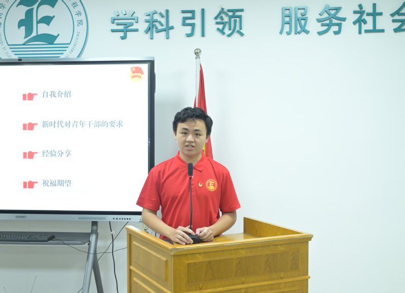叶梓健同学紧紧围绕习近平总书记对新时代中国青年干部的要求,从筑牢理想信念根基、发扬担当和斗争精神、练就过硬本领三方面详细解读习近平总书记送给新时代中国青年干部的“学习指南”。叶梓健同学结合自己学生干部经历,分享了作为一名大学生骨干,要时刻谨记习近平总书记的要求,带着“责任心”和“好胜心”,努力提升自我;带着“平常心”和“好奇心”,认真落实学生工作;带着热爱和情怀,和同学们去理解、去陪伴、共同成长。