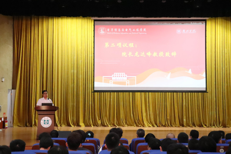 第二项议程,院长龙达峰发表了热情洋溢的致辞。他向在座的新生们深入阐释了学校的办学理念与学院的育人模式,并巧妙结合惠州蓬勃发展的经济态势,为新生们开启了一扇洞悉时代需求与个人发展机遇的全新窗口,让大家对未来的学习与生活有了更为清晰的认识。最后,龙院长满怀期许地鼓励新同学们在大学时光里奋勇拼搏、力争上游,书写属于自己的精彩篇章。