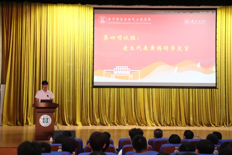 第四项议程,老生代表是来自2023级电信3班的黄博同学,他结合自身两年大学生活,向新生分享成长经验。他分享了在紧凑课程学习中探索知识奥妙的乐趣,积累知识、锻炼能力的经历。凭借两年技术积累,黄博与团队斩获第二十届全国大学生智能汽车竞赛全国一等奖、机甲大师全国二等奖、电子设计大赛广东省一等奖等 14 项赛事奖项。他向新同学提出三点建议:一是注重学业,投入足够时间精力攻克专业课程,打好基础;二是学会合作,与伙伴携手解决复杂问题、实现突破;三是找到兴趣,以热爱为动力,在困难面前坚持前行。