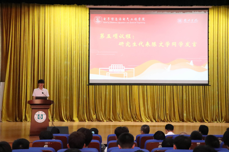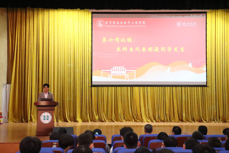 第六项议程,2025级电信 5 班的胡俊同学作为本科新生代表发言。胡俊提出三点规划与同学们共勉:一是打牢知识基础,如《高等数学》、《电路原理》、《C语言》等核心课程,通过课后梳理知识点、组建学习小组协作讨论巩固所学;二是积极走进实验室,将理论知识转化为实践能力,主动参与课题研究与学科竞赛,在焊接、编程、调试的实践中练就真本领;三是保持好奇心,关注《电子学报》等行业期刊与前沿学术讲座,量子计算突破等技术发展趋势,在科技浪潮中主动学习,肩负起“用技术改变世界”的责任。