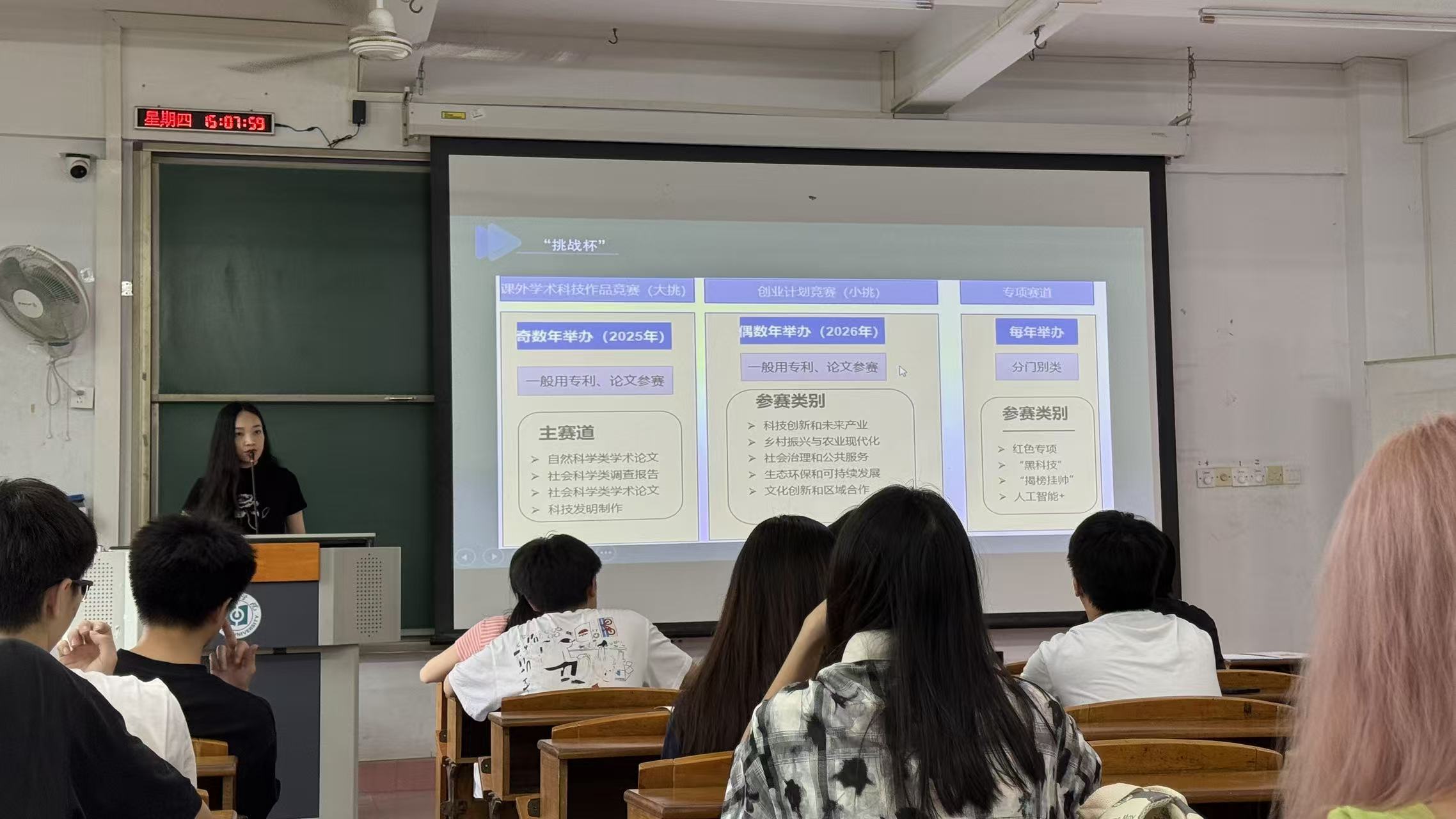 张舒婷以三大赛道为核心解析选题逻辑:挑战杯需聚焦“小切口+真问题”:攀登计划当锚定省级重点方向:三下乡应紧扣“百千万工程”,强调选题需兼具社会热点、创新性、可行性及社会价值。关于项目的立项、过程管理以及成果转化等,张舒婷以大量的获奖案例展开讲解,她指出科创实践三重价值:能力增值--专利论文助力考研就业;视野拓展--通过“青年科学家进企业”对接产业需求;精神淬炼--在乡村一线践行科技为民使命。