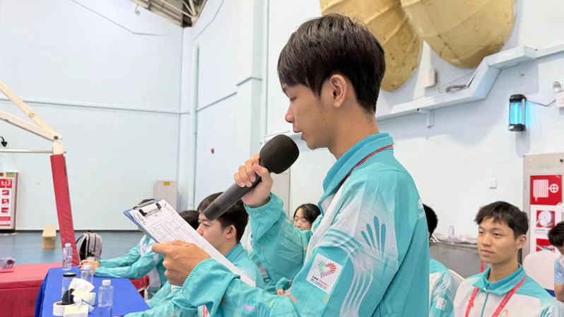 运动员检录区的党员志愿者按赛事流程分工协作:一检环节核对运动员证件与随身物品,严守安全关;二检环节则对照赛事标准,复核护具规格与穿戴合规性,确认无误后引导至候赛区,确保检录流程规范高效。