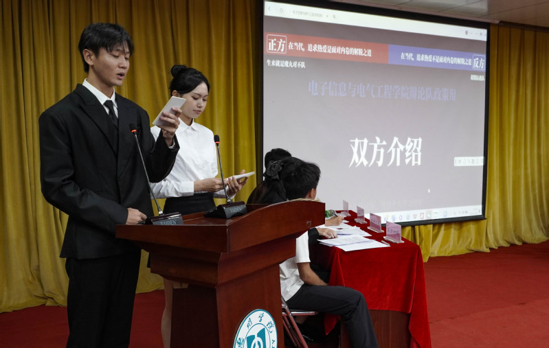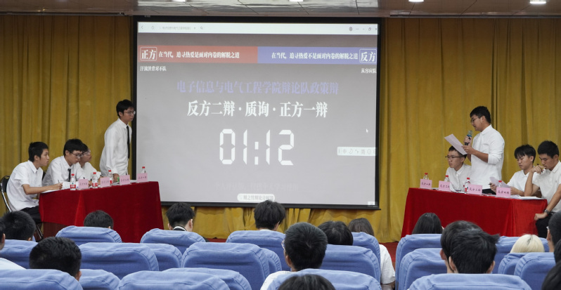 决赛辩题为“在当代:追寻热爱是面对内卷的解脱之道vs追寻热爱不是面对内卷的解脱之道”,辩题直击青年成长焦虑,紧扣当下社会热点,引发全场深度共鸣。比赛一触即发,双方辩手迅速进入状态,在立论环节、自由辩论、总结陈词等环节中各抒己见,据理力争。