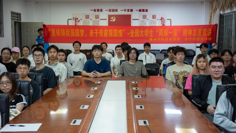 宣讲人沿着历史脉络,把珍贵史料与生动故事相结合,带领新团员回顾那段艰苦卓绝的奋斗历程。面对国外技术封锁,毛泽东同志果断作出“搞原子弹”的战略决策;随后,九院、221基地在戈壁荒原迅速建成。王淦昌化名“王京”,隐姓埋名17年;郭永怀、程开甲等科研人员带着铺盖住进帐篷,喝苦水、战风沙,在极端恶劣条件下日夜钻研。中央专委统筹协调,全国上下“大力协同、勇于登攀”,凝聚起强大力量。科研人员“死在戈壁滩,埋在青山头”的誓言与坚守,让新团员深刻领悟到“两弹一星”精神的内核:把国家利益放在首位的忠诚、自力更生突破难关的坚韧,以及科研人无私奉献的家国担当。