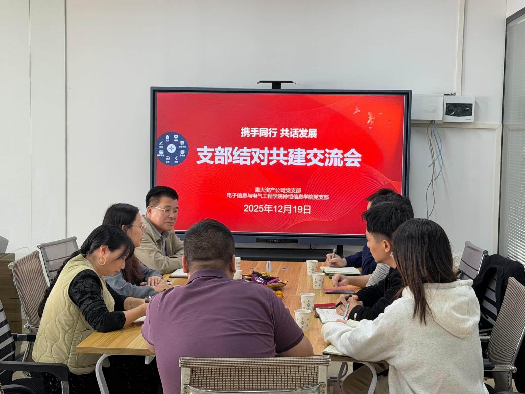 为深化党建引领作用,深化资源共享与业务融合,2025年12月19日,电子信息与电气工程学院仲恺信息学院党支部与惠大资产公司党支部联合开展“携手同行,共话发展”结对共建活动。