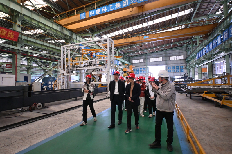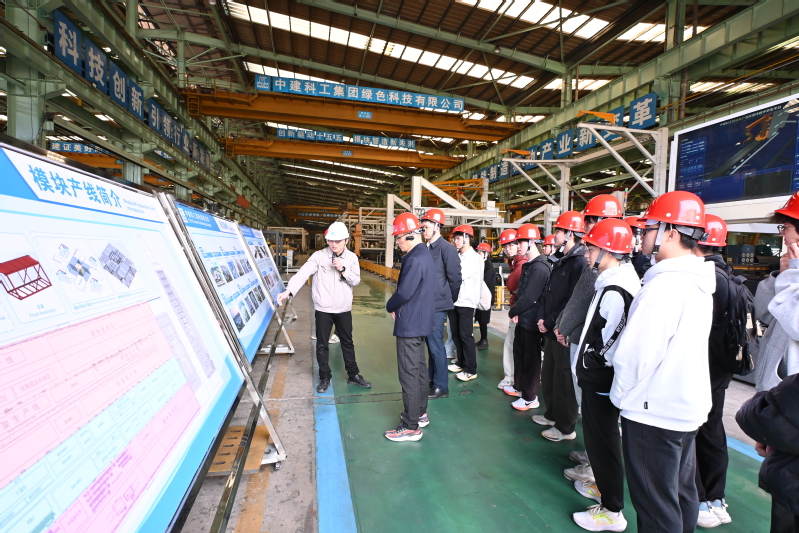 中建科工绿色科技公司模块化工厂党支部副书记黄青山热情接待了学院师生一行,并带领大家参观了中钢结构装配、机器人切割设备操作、焊接机器人工作站等生产车间,以及X-Park零碳智慧园区。先进的生产设备和智能化的操作流程让学生们直观感受到科技赋能制造的魅力,零碳园区的绿色理念也引发了师生们的浓厚兴趣。