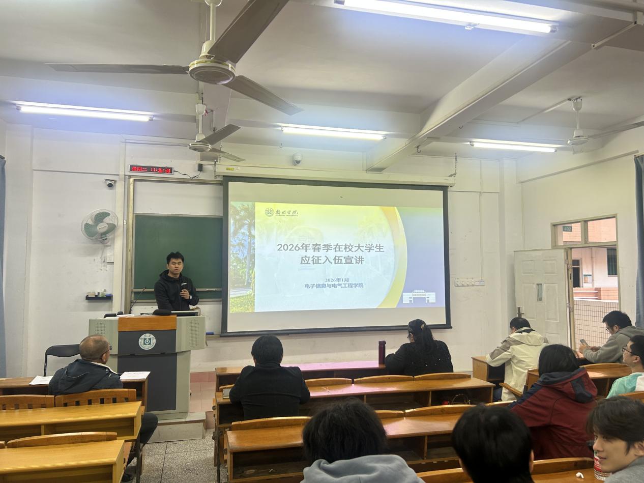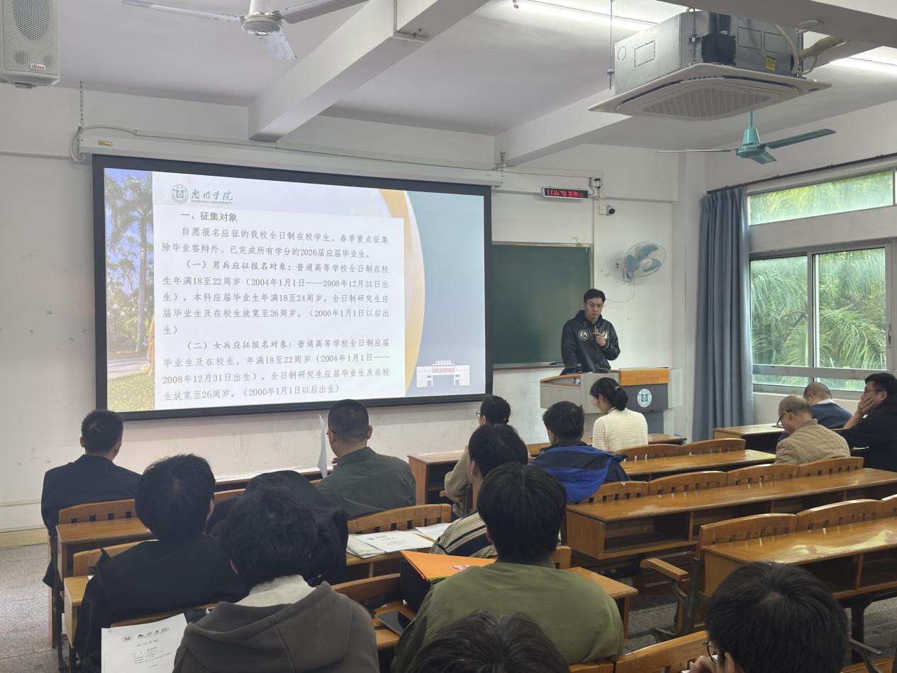 2026年1月14日,我院面向全体毕业班学生召开征兵政策宣讲会,旨在鼓励毕业生响应国家号召,积极投身军营建功立业。会议围绕大学毕业生应征入伍的“三笔账”——政治账、发展账、经济账展开系统解读,结合具体政策与案例,帮助学生全面了解参军优势与成长路径。